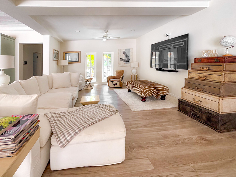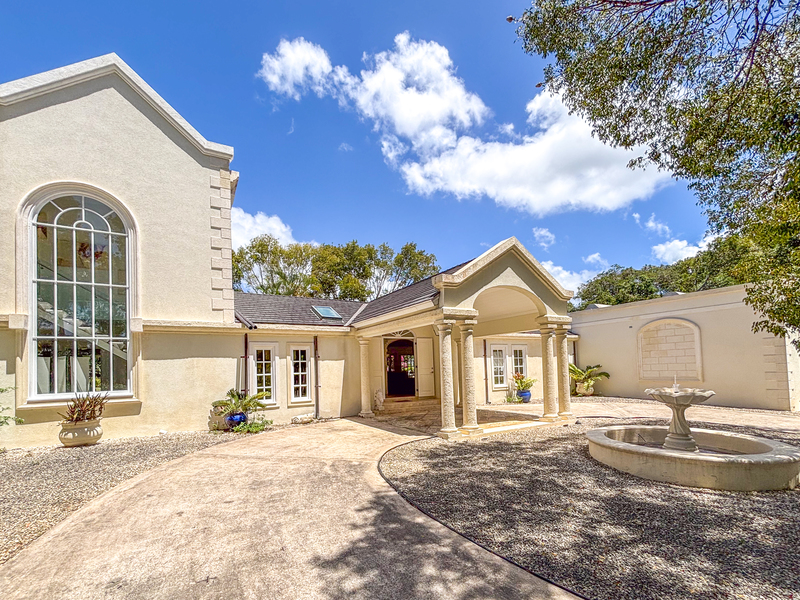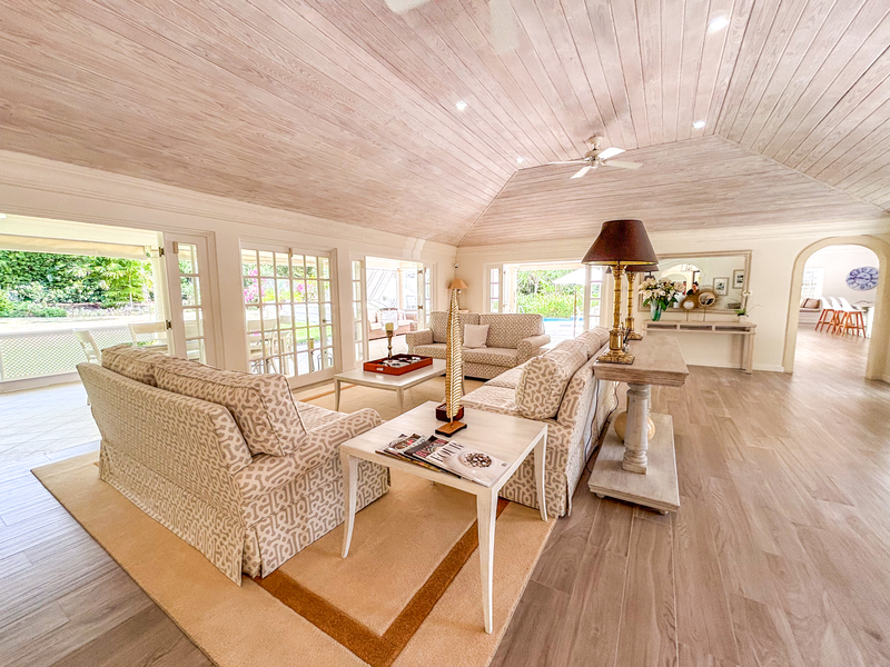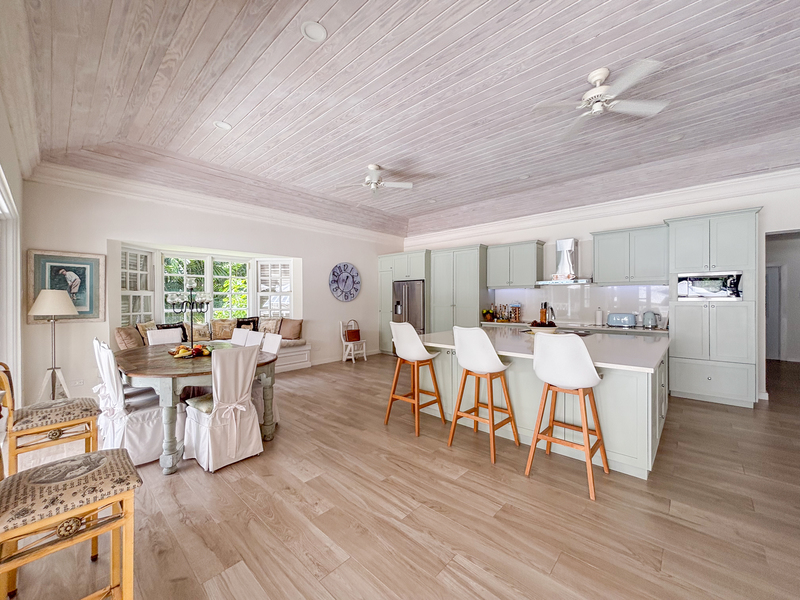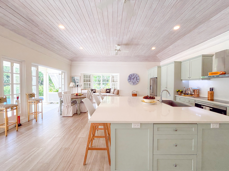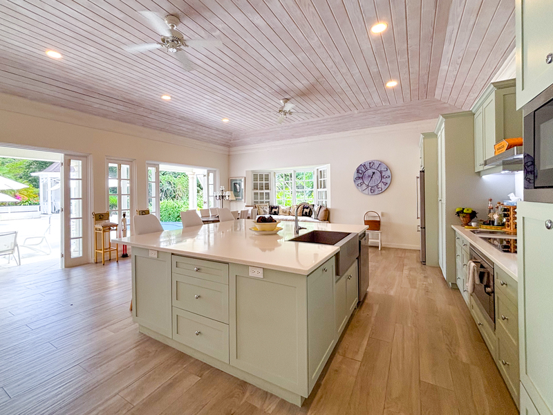 Sitting on 1.3 acres and surrounded by lush landscaped gardens, this 7,600 sq ft villa offers privacy, with indoor and outdoor living. The large living room opens on to an outdoor dining terrace with a fully equipped bar, and extends around to a spacious pool deck and lounge area with a dining gazebo. The outdoor spaces offer many options for dining and lounging with friends and family, while enjoying the tropical oasis of mahogany trees and flowering plants. The open plan kitchen is fully equipped with modern appliances and fixtures, with a large dining space and multiple lounge areas.