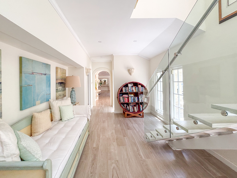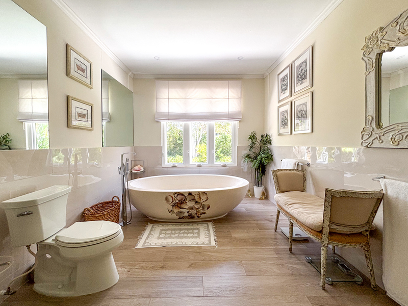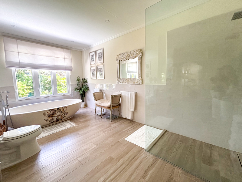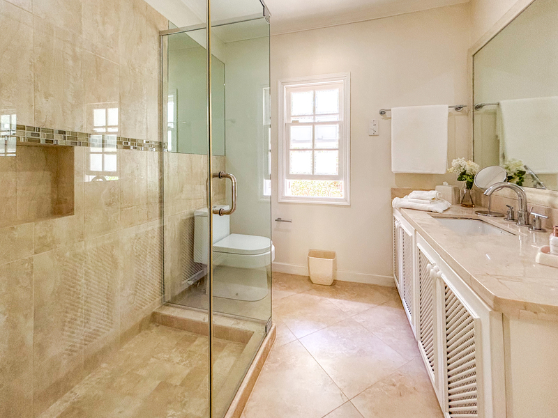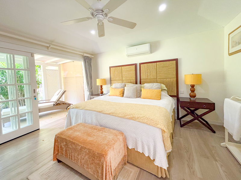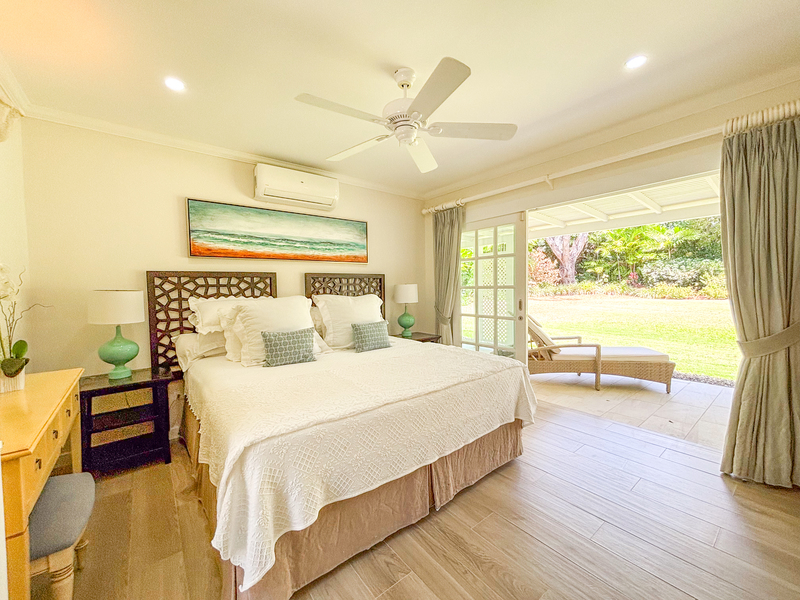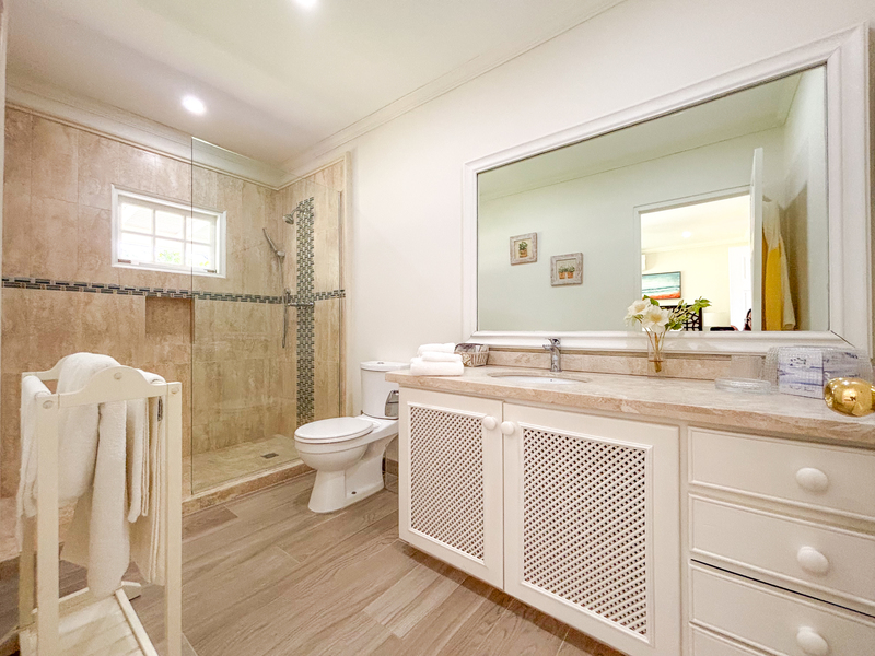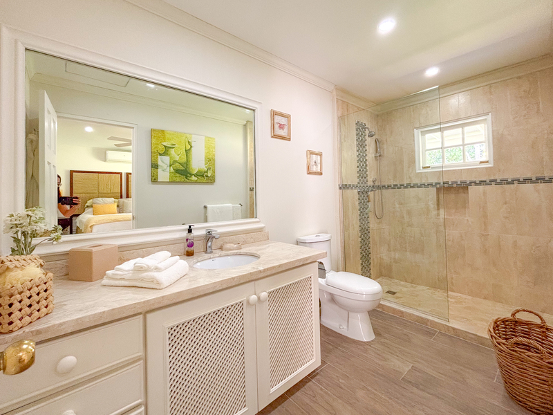 Three of the four bedrooms are located on the ground floor, each with an outdoor terrace leading out to the spacious front lawn, allowing the cool tropical breezes to flow through the villa. Each bedroom is air conditioned with an ensuite bathroom. Tall glass windows allow natural light into the space directly outside of the bedrooms. The primary suite is located upstairs, offering a generous bathroom with a freestanding tub and large walk-in shower. There is a spacious walk-in closet offering ample storage and the terrace overlooks the front garden.