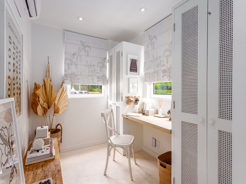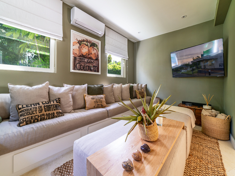 The main house features three spacious en-suite bedrooms, a serene living area that opens onto a covered dining terrace, a hidden media lounge, and a dedicated home office. The designer kitchen, outfitted with stainless steel appliances and custom cabinetry, flows seamlessly to outdoor lounges and terraces, perfect for entertaining or enjoying the tropical surroundings.