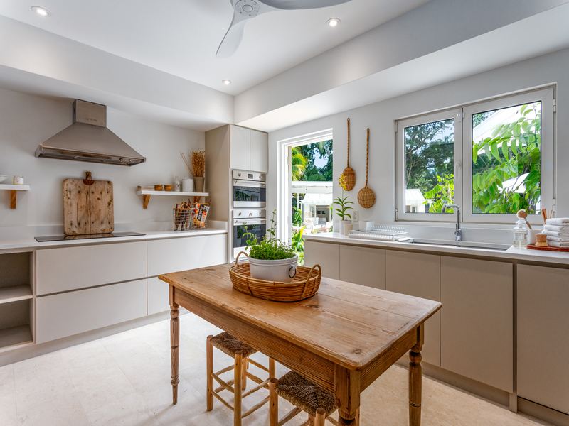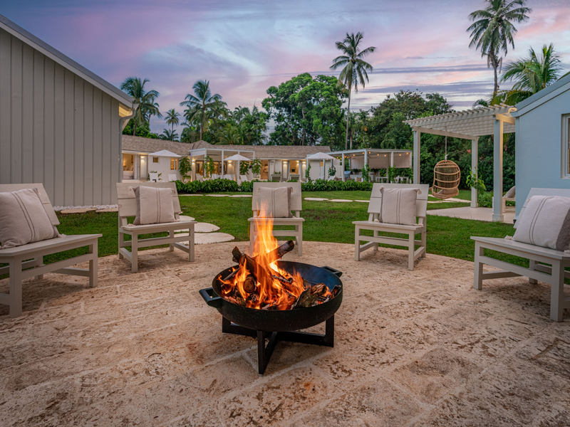 A charming guest cottage adds two additional en-suite bedrooms with private terraces and a kitchenette, ideal for visitors or extended family. At the heart of the property, a central courtyard frames a sparkling saltwater pool, while lush gardens, a firepit, and outdoor dining spaces create a true island sanctuary.