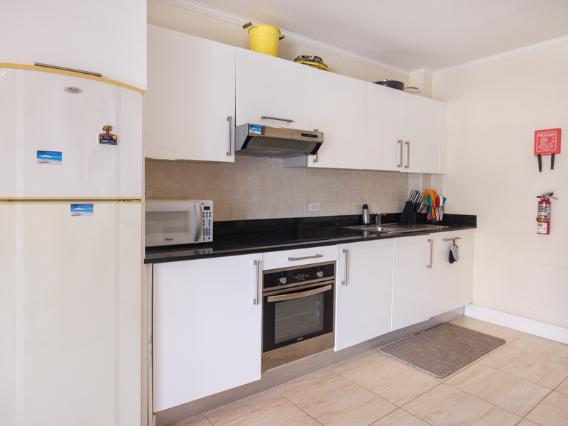 The open-plan living and kitchen area is bright and welcoming, flowing seamlessly onto a covered terrace—perfect for outdoor dining, relaxing, or enjoying views of the Caribbean sea. The kitchen is fully equipped with modern appliances and clean, stylish finishes, creating a space that is both practical and comfortable.