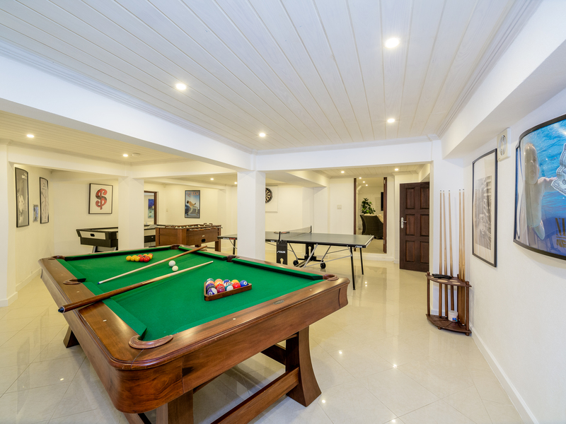 The epitome of Caribbean luxury, the entire top floor accommodates an amazing and very private master bedroom suite with ensuite bathroom, walk in wardrobes and an oversized terrace providing superb sea and luscious tropical garden views. In addition to the internal stairs, this impressive balcony and master bedroom suite can also be accessed via an external staircase leading from the magnificent pool and decking. Amenities on the lower level, entered either externally or from the lounge, include a large cinema room with a one hundred-inch TV, a well-equipped gym and an adjacent games room with pool table, air hockey, table tennis, darts, and table football. There is also a bar/relaxation area situated on this level.