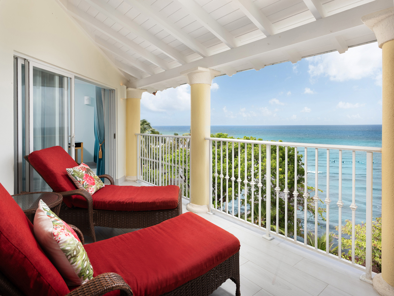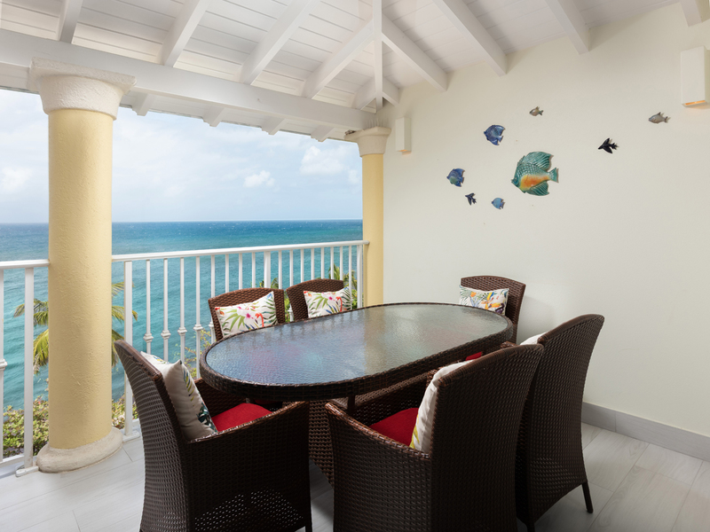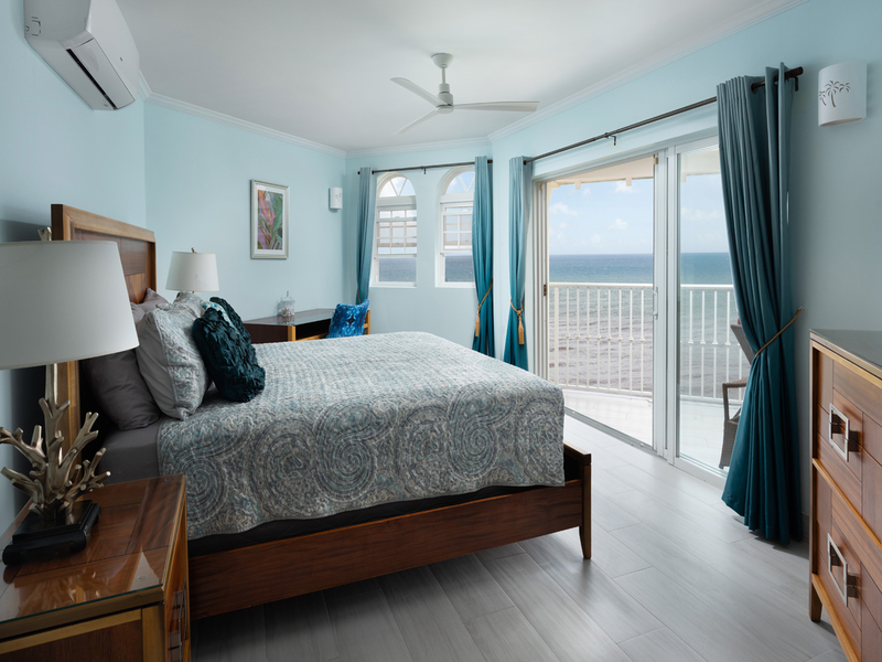 Expansive glass doors lead out to a generous covered balcony, perfect for al fresco dining or relaxing with the sound of the waves as your backdrop. The primary suite is a serene retreat featuring a king-sized bed, "his and hers" closets, and a spacious en-suite bathroom with a double vanity. Positioned to make the most of the panoramic ocean views, this suite allows you to wake up to the beauty of Barbados each morning.