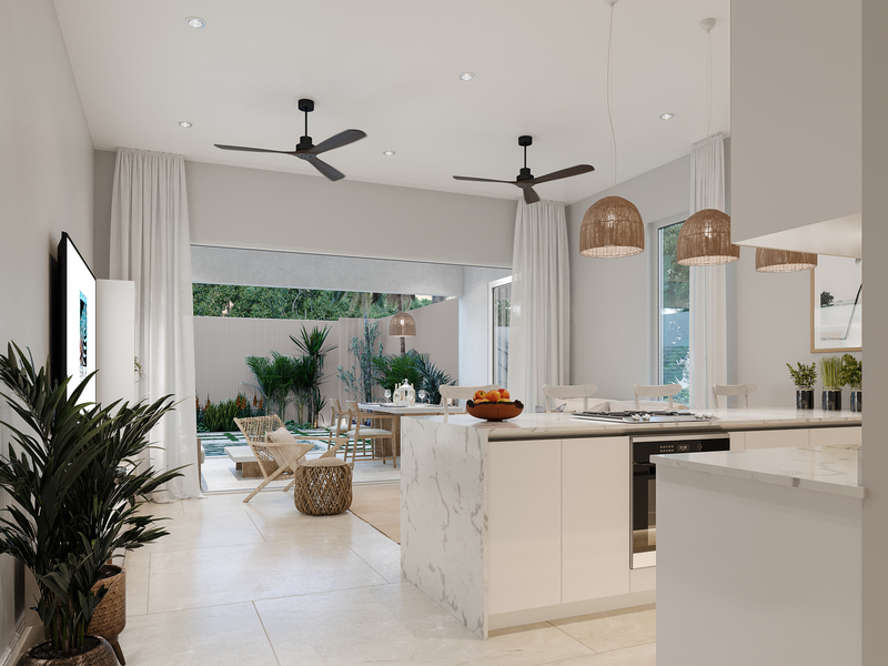 The open-plan living area brings the outside in. With full folding glass doors that greatly expand the internal living area and allow for full use of the covered patio, offering relaxed dining and social areas poolside. Also on the main level is a guest bedroom which can also double as an office if required.