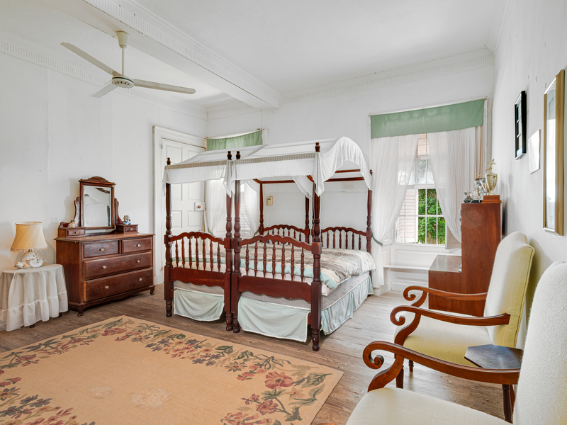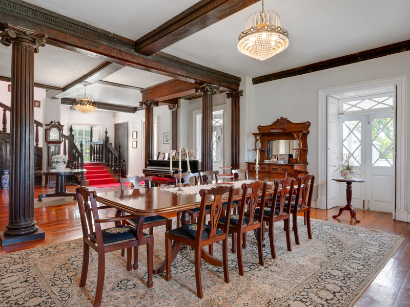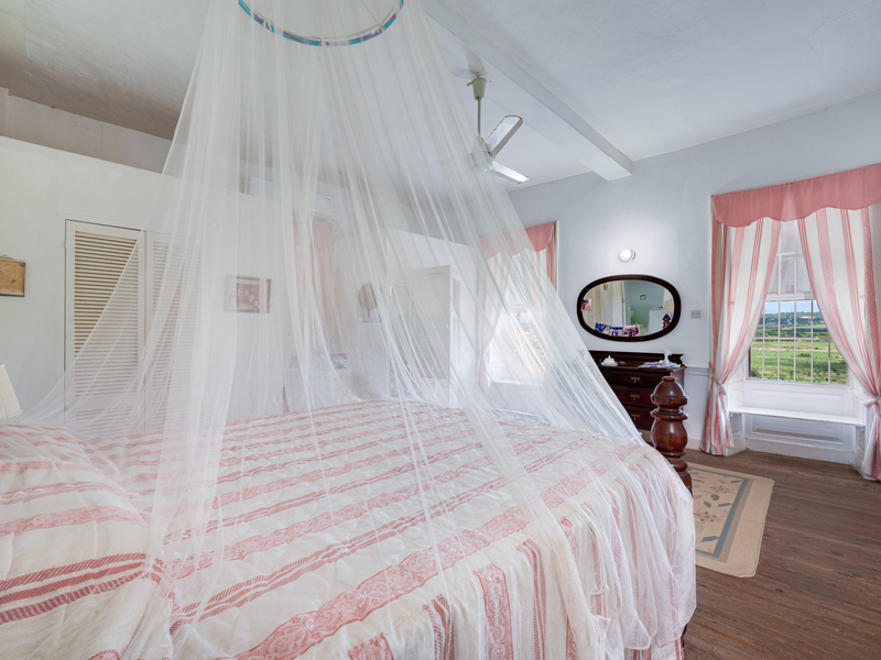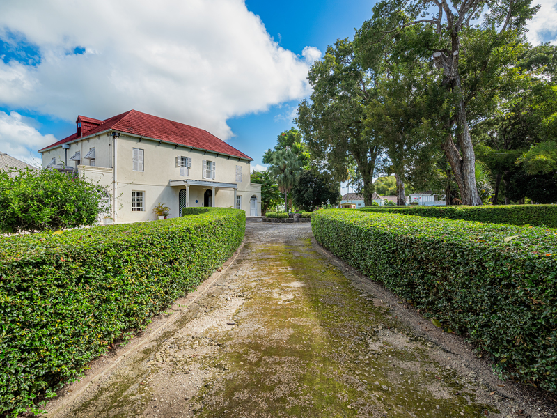 The spacious dining room features unique large carved mahogany pillars and are complemented by a unique staircase of carved mahogany rails. References have been made in historic publications to the grand feasts held in this unique dining room. From the top floor a small stairway leads to the “fish pond” roof referred to in “A to Z of Barbadian Heritage” by Henry Fraser et al; and is probably the only example remaining today in an occupied property. At the Northwestern end of the property a coral stone wall with arches, forms a courtyard which includes a “drip stone” and a water gutter header dated 1807 and cast in solid ½” lead. The entrance to the home features marble floor tiles, a stained-glass window over the front door, and a unique window similar to those swinging types found in old churches.