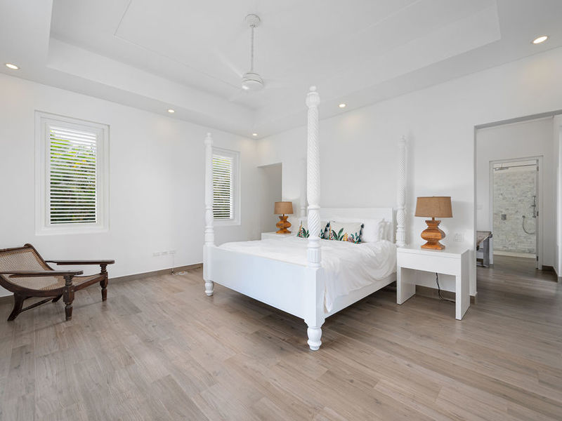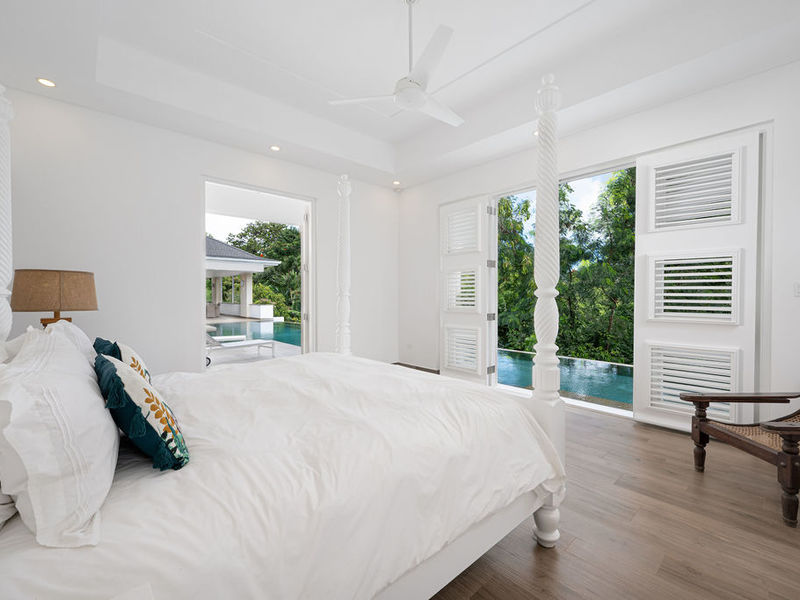 All four bedrooms are ensuite and furnished with king beds, private outdoor patios, and shuttered openings that invite natural ventilation and cooling breezes. The primary suite features a generous seating area, a large ceiling fan, and direct access to the pool terrace.