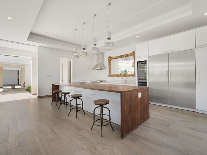 This 4,634 sq. ft. home follows an open-plan layout anchored by roll-shutter doors in the main living area, which create a seamless indoor–outdoor flow while providing security when closed. Designed for entertaining, the home centres around an eighty-foot infinity-edge pool with views across the gardens and golf course.